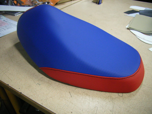 ホンダのディオのシートを合皮の青と赤で張替え致しました。