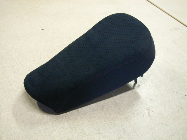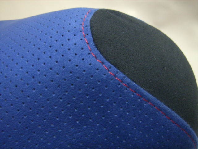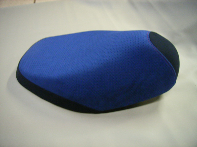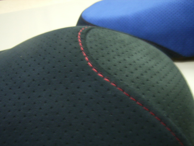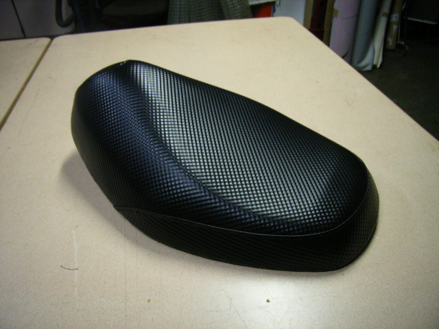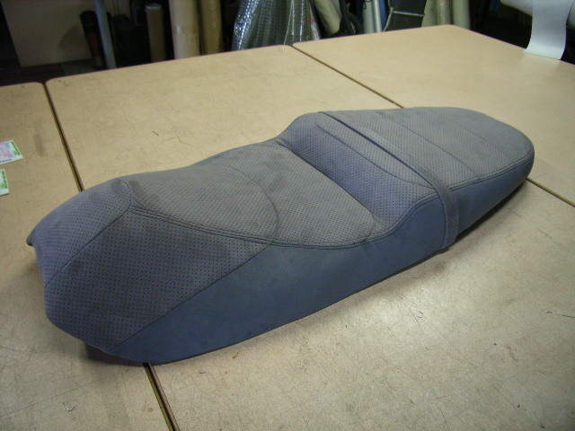 今回使用した布地はアルカンターラのパンチングと無地の布地のコンビで仕上げました、合皮のレザーが大半を占めるスクーターの中では一段と目を引くシートに仕上がりました。