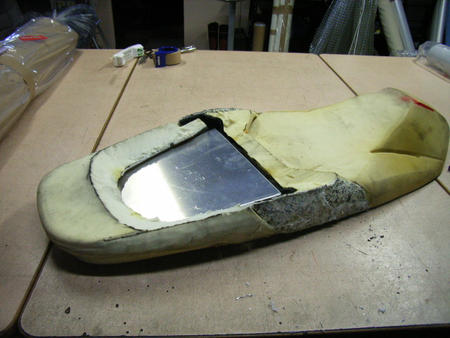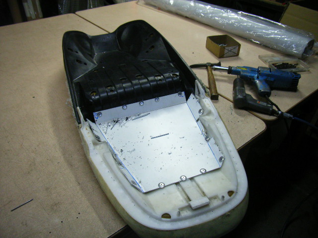 シートのベース部までのカットとなりますので補強にアルミ板を裏からリベットで固定します。