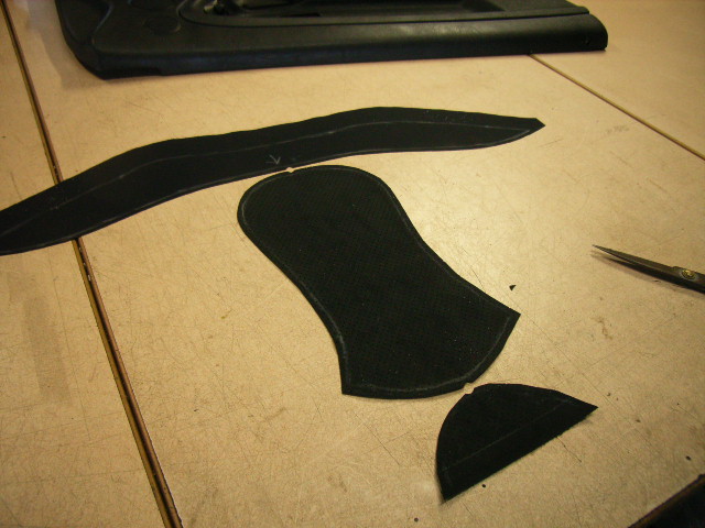 張替えに使用する布地に型どおりカットラインを転写し布地をカットしますくれぐれも縫いしろ分のカットをお忘れ無く。